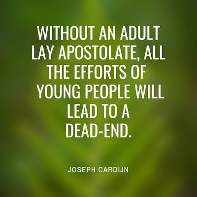 And yet the impact of the YCW and YCS in forming generations of Catholics has been extraordinary, their good work and influence incalculable.4 Almost within the lifetimes of the pioneers, their stories, and their method, have either been forgotten or dismissed.